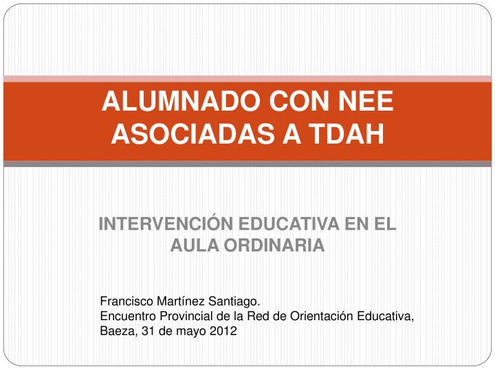 Presentación del taller “La intervención con alumnado con NEE asociadas a TDAH en el aula ordinaria”, enmarcado en el ENCUENTRO PROVINCIAL DE LA RED DE ORIENTACIÓN EDUCATIVA sobre Intervención educativa ante los Trastornos Graves de Conducta y Trastornos Específicos de Lectura, celebrado en Baeza, el 31 de mayo de 2012.